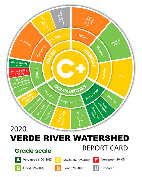 Assessing the health of a watershed as complicated as the Verde is an enormous challenge. To do so we identified three focus areas, Water, Habitat, and Communities. The health of the Verde's waters were measured as the average of its water quality, water quantity, and water management. To measure the health of the Verde River Watershed's habitats, we assessed the state of its upland, riparian, and aquatic ecosystems. Finally, we assessed the vitality of our communities by measuring housing affordability, education, unemployment, and recreation.